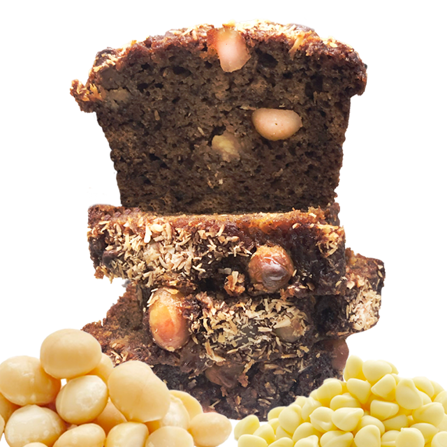 Indulge in our Hawaiian-inspired banana bread. This moist, flavorful treat combines the crunch of Macadamia nuts with the sweet creaminess of white chocolate, and finally topped with toasted coconut flakes creating a harmonious blend of textures with evey bite. A definite must-try!